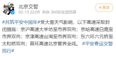 据北京市公安局公安交通管理局官方微博“北京交警”发布的消息,受大雾天气影响,北京市以下高速采取封闭措施:京沪高速大羊坊至市界双向;京哈高速白鹿至市界双向;京津高速台湖至市界双向;东六环六元桥至太和桥双向;首环高速北京管界全线。