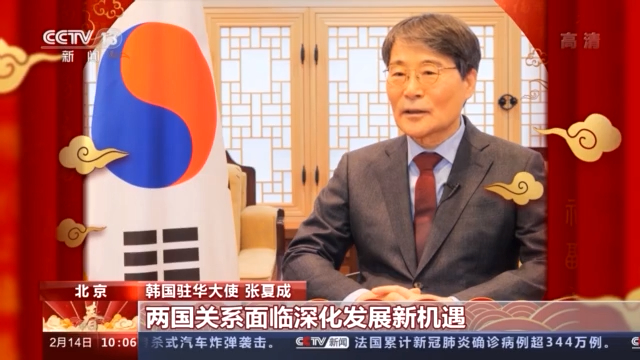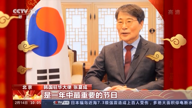 韩国驻华大使 张夏成: 春节对韩中两国人民来说是一年中最重要的节日,也是春天的开始。春节是家人团聚、为新年祈福的快乐的节日,在新的一年里我祝愿韩中两国人民迎来安康和幸福。