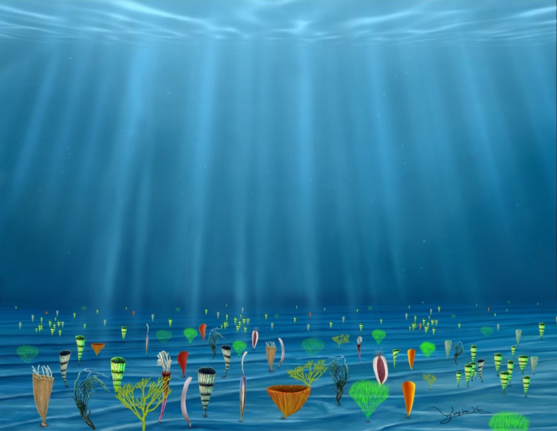 (约6亿年前的远古海洋复原图。中科院南京地质古生物研究所供图。)