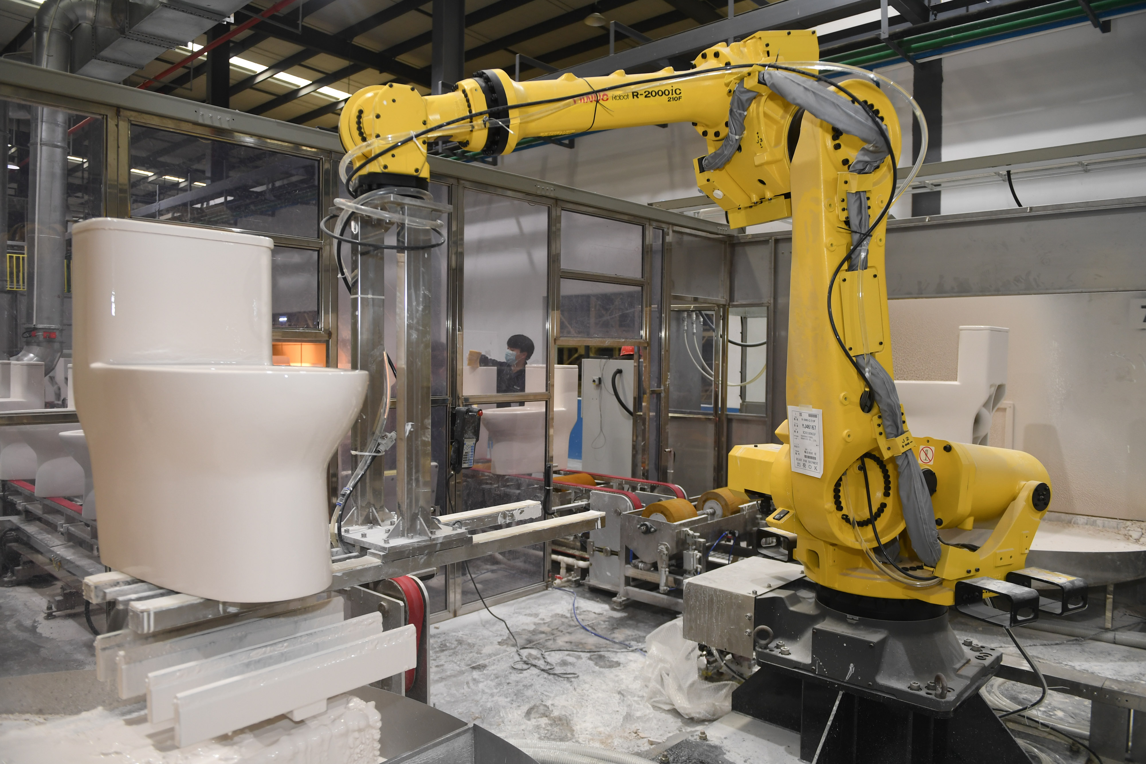 (1月13日,智能机器人在福建省首家5G智慧陶瓷工厂生产洁具。新华社记者 宋为伟 摄)