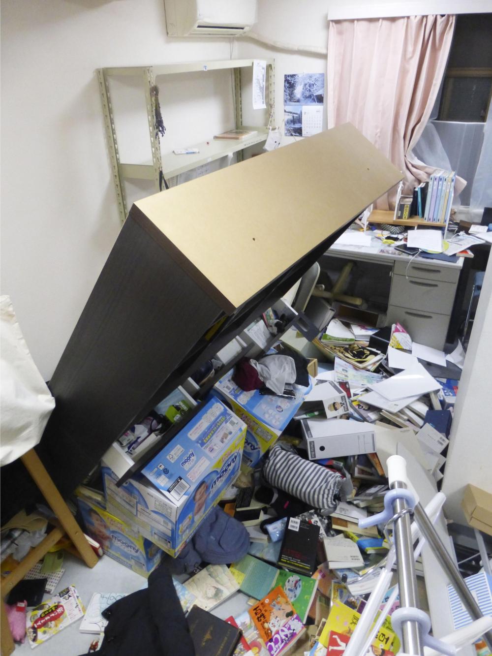 2月13日,日本福岛县郡山市居民家中的家具被地震晃倒。新华社/共同社