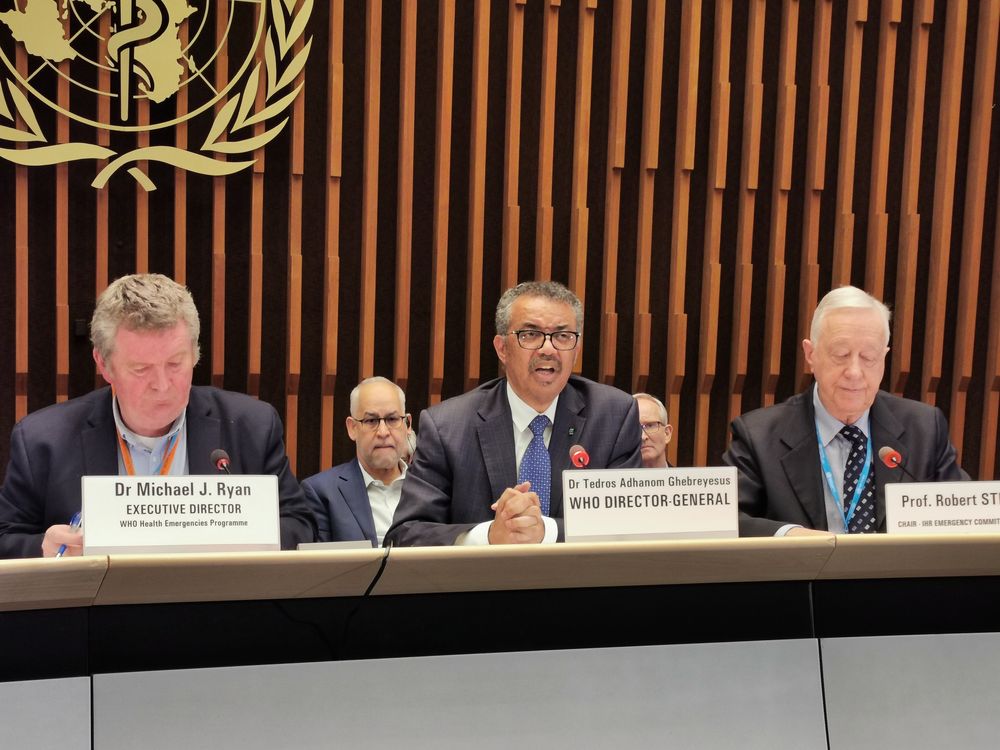 2020年2月12日,世界卫生组织在瑞士日内瓦宣布,刚果(金)埃博拉疫情仍然构成国际关注的突发公共卫生事件。图为世卫组织总干事谭德塞(中)出席新闻发布会。(新华社记者陈俊侠摄)