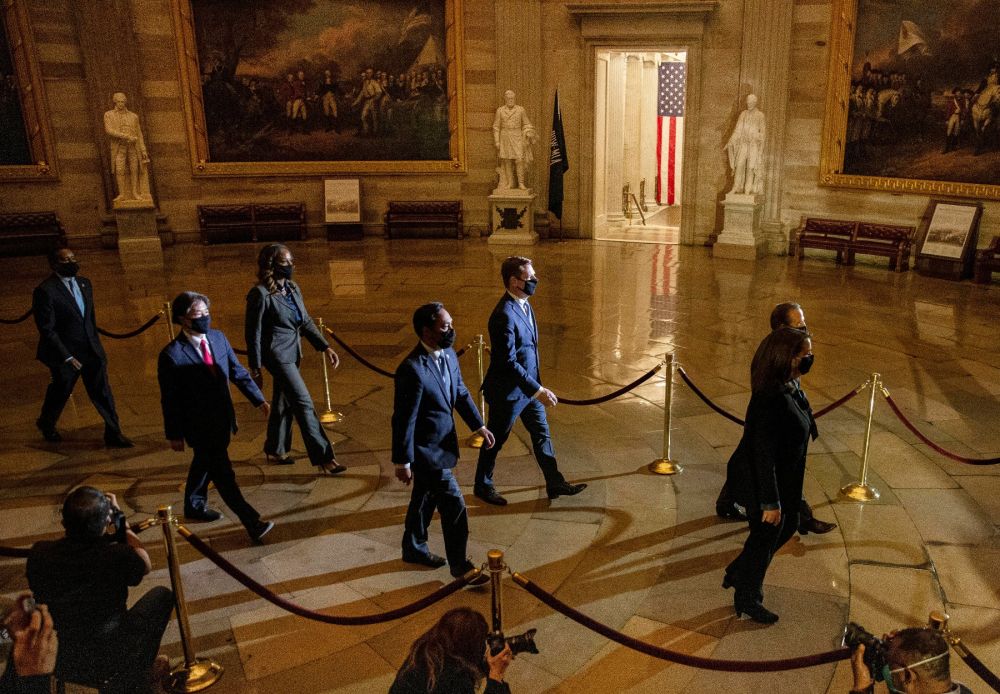 1月25日,美国国会众议院民主党人把指控美国前总统特朗普“煽动叛乱”的弹劾案送交参议院审理。图为在美国首都华盛顿国会大厦,由众议院多位民主党人组成的特朗普弹劾案“管理人”团队将弹劾文件送至参议院议事厅。(新华社发,亚伦摄)
