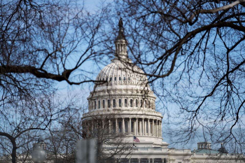 美国国会参议院2月9日正式启动对前总统特朗普弹劾案的审理。特朗普是美国首位两度被弹劾的总统,同时也是首位卸任后面临弹劾案审判的总统。这是9日在美国华盛顿透过树枝拍摄的国会大厦。(新华社记者刘杰摄)