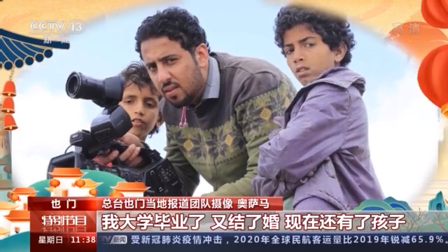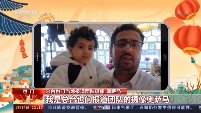 总台也门当地报道团队摄像 奥萨马: 同总台一起合作期间,我大学毕业了,又结了婚,现在还有了孩子。我希望早日实现和平,我的孩子在和平环境里成长,我祝所有中国同事和中国人民春节快乐,在新的一年中我们将像牛一样瞪大眼睛,盯住新闻,春节快乐,牛年大吉!