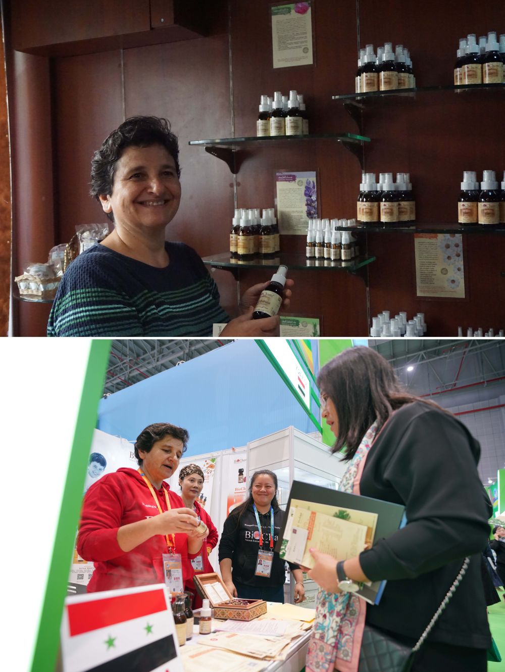 这是一张拼版照片,上图为:2018年10月23日,在叙利亚首都大马士革,鲁拉·阿迪卜展示自家企业生产的玫瑰纯露(新华社记者汪健摄)。下图为:2018年11月6日,在首届中国国际进口博览会上,鲁拉·阿迪卜(左一)向人们介绍玫瑰纯露(新华社记者孟鼎博摄)。