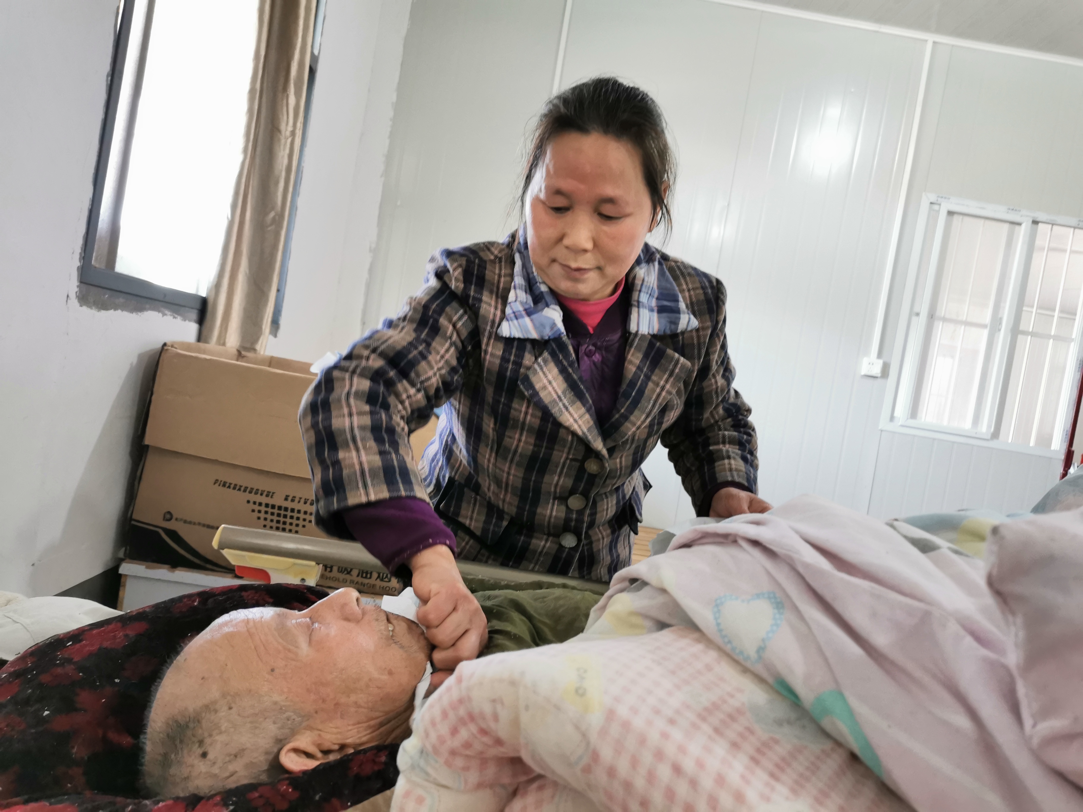 2月13日,傅兴芳为卧床不起的老人擦汗。 新华社记者徐海涛摄