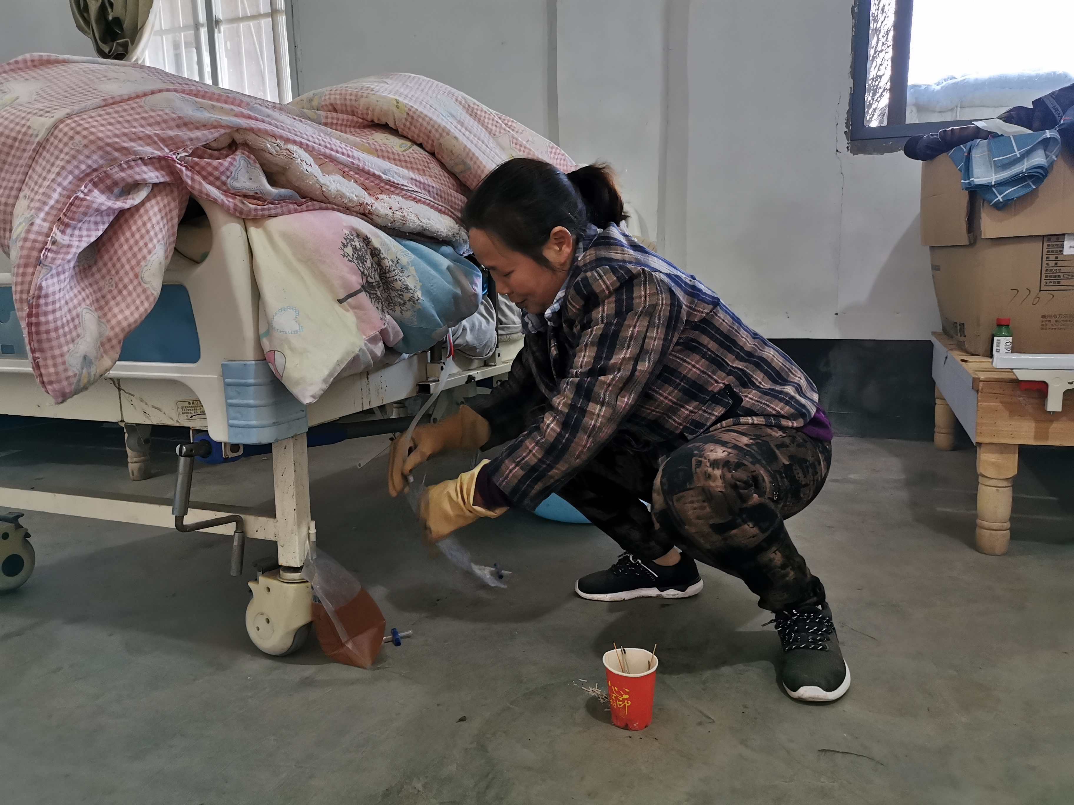 2月13日,傅兴芳为失能老人更换尿袋。 新华社记者徐海涛摄