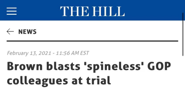 投票赞成特朗普有罪的共和党参议员施罗德·布朗则表示,特朗普滥用职权、煽动暴力的罪行是显而易见的,其他共和党参议员畏惧特朗普才不敢投赞成票,是“没有脊梁骨”的表现。