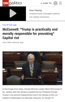 △CNN报道,麦康奈尔称在事实和道德层面上,特朗普均应为国会遭暴力冲击事件负责