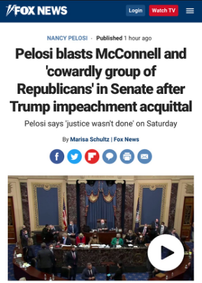 众议院议长南希·佩洛西对麦康奈尔的言论嗤之以鼻。佩洛西指出,众议院将弹劾案提交给参议院时特朗普仍然在任,然而时任参议院多数党领袖的麦康奈尔却以参议院进入休会阶段为由,拒绝审理弹劾案,这才导致该案被拖延到特朗普下台才得以开庭审理。佩洛西表示,参议院没能伸张正义,麦康奈尔的演讲无真诚可言。