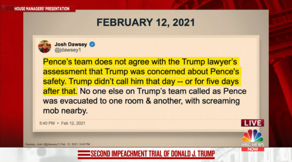 弹劾管理人团队在陈述中还引用了一则推文,以证明特朗普不曾过问时任副总统彭斯的安全。这则发表于2月12日的推文同样未按规定在庭审前提交参议院。共和党参议员迈克·李当场提出质疑,参议院因此再度休庭,最终弹劾管理人团队被迫放弃引用该推文。