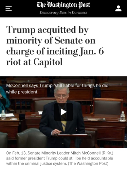 △《华盛顿邮报》报道,美国国会参议院宣布特朗普无罪