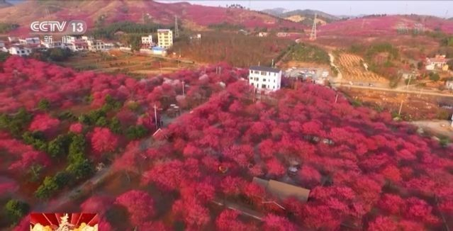 春节期间,湖南桂阳县的樱花逐渐绽放,成片的樱花遍布峰峦之间,漫山遍野的粉红,像彩霞笼罩了整片山林。