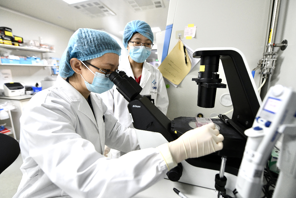 “繁育”这些细胞可是一个细致活儿,得在负压细胞间里完成。邓洪婧穿上工作服,戴上口罩、防护帽,走进细胞间。她从培养箱取出细胞培养皿,置于显微镜下,观察细胞的生长情况;再加入胰蛋白酶,让细胞从培养皿脱落、分离,悬浮在培养基里;最后离心收集细胞,用移液枪吸取部分细胞转移至新的培养基中。等所有的工作完成,一个上午的时间已经不知不觉过去。