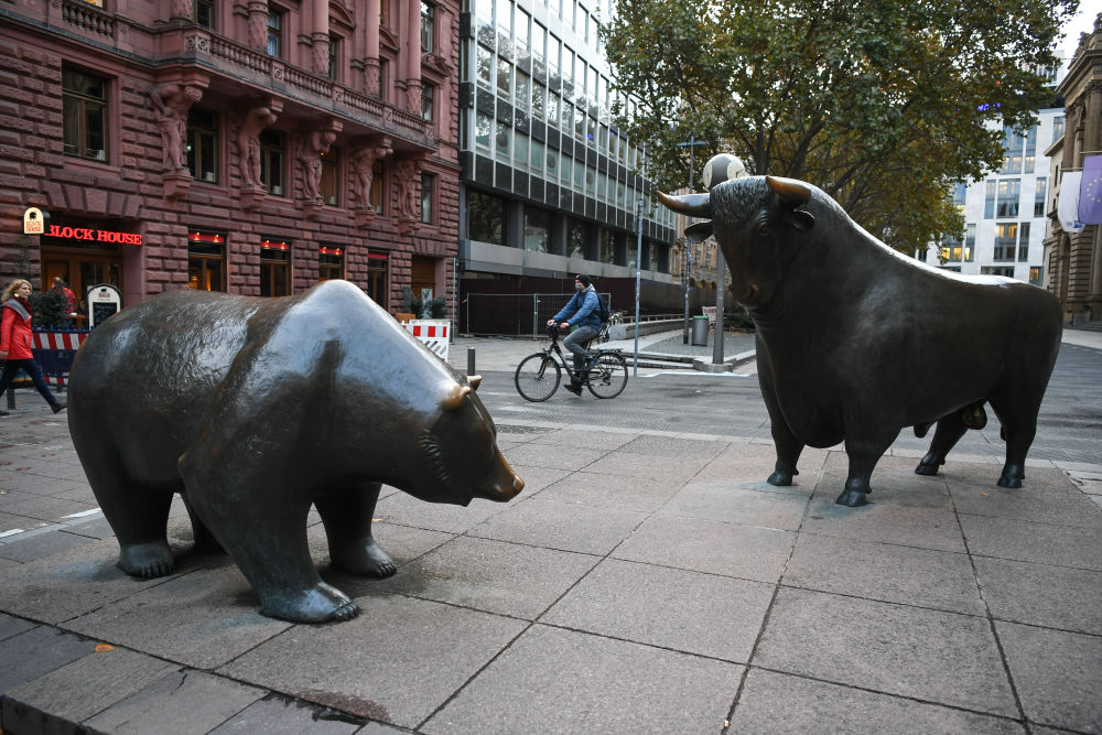 ↑2020年10月28日在德国法兰克福证券交易所外拍摄的“熊牛对峙”雕塑。熊、牛雕塑分别象征“熊市”和“牛市”。新华社记者 逯阳 摄
