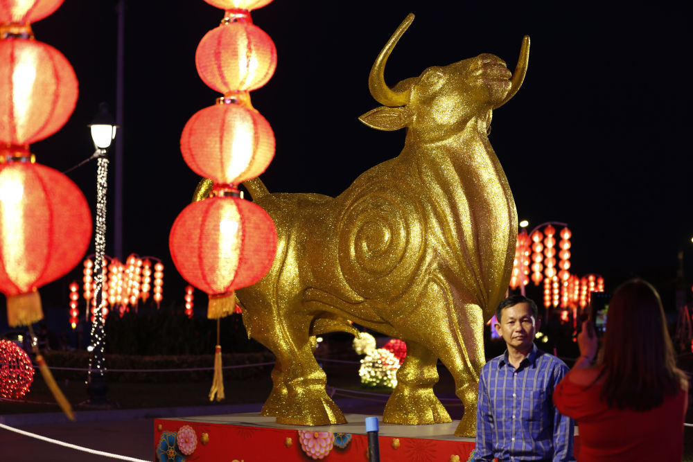 ↑2021年2月8日,在柬埔寨金边,一名男子与一处牛的雕塑合影。随着农历春节临近,大红灯笼、彩灯等春节装饰品开始出现在柬埔寨金边街头。 新华社发(索万纳拉摄)