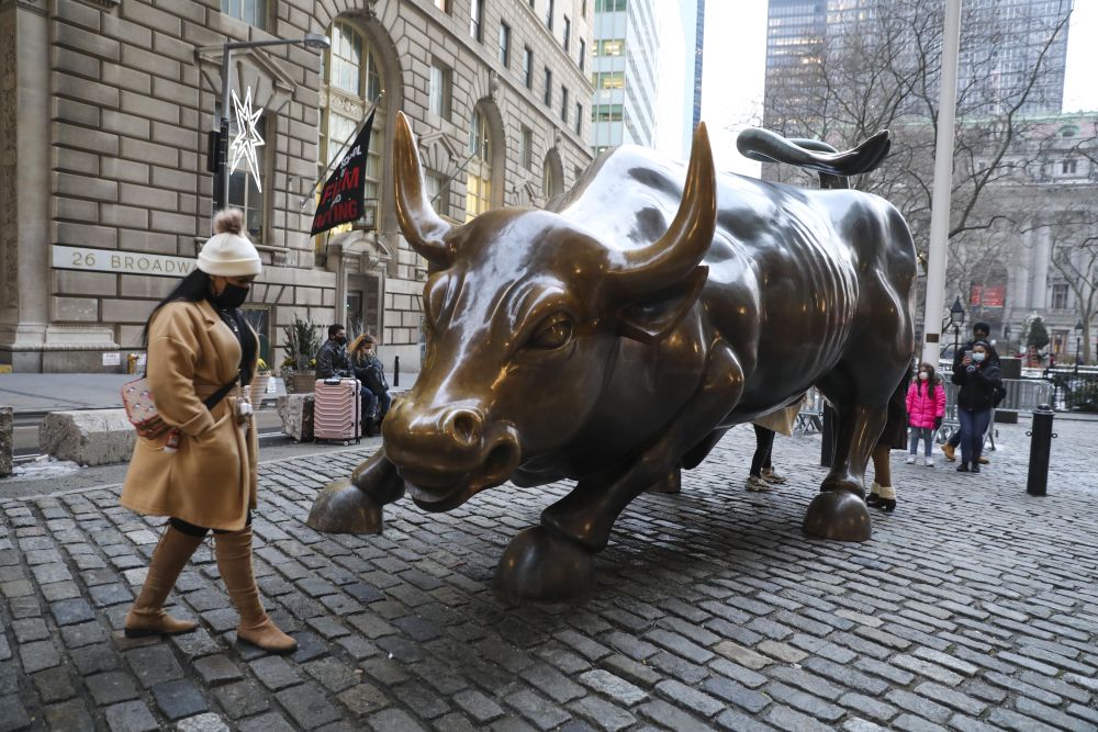 ↑2020年12月21日,在美国纽约,一名戴口罩的女子走过华尔街铜牛。华尔街铜牛于1989年被安放于曼哈顿金融区华尔街附近,很快成为纽约地标。由于靠近纽约证券交易所,又象征着“牛市”,它也是美国金融市场重要的“吉祥物”。新华社记者 王迎 摄