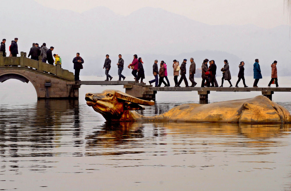 ↑游客们在浙江杭州西子湖畔欣赏“金牛戏水”雕塑(2009年1月28日摄)。在民间传说中,杭州西湖因古时曾有金牛出现而又称“金牛湖”。 新华社记者 谭进 摄