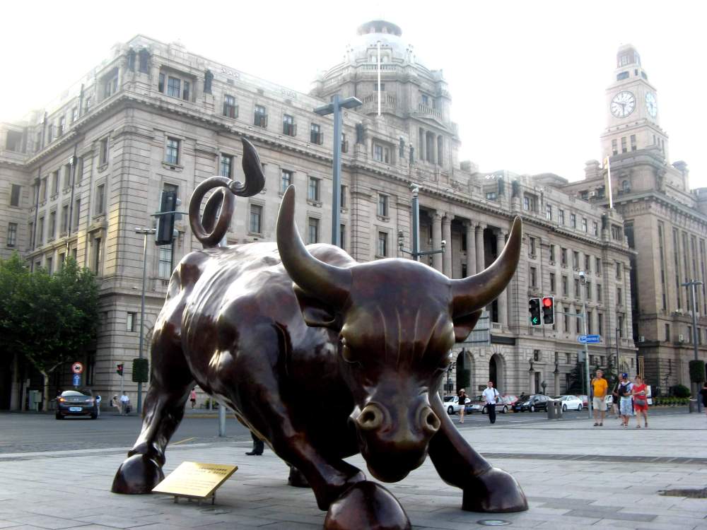 ↑这是2011年7月29日拍摄的上海金融广场上的金融牛。“外滩金融牛”由国际著名雕塑大师阿图罗·迪·莫迪卡设计创作,于2010年3月制作完毕。“外滩金融牛”作为外滩金融集聚带重要的文化符号,为上海国际金融中心建设增添新的文化内涵。新华社发(严大明 摄)