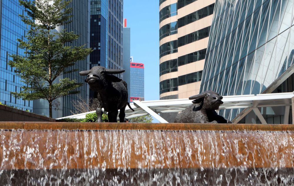 ↑2017年12月29日在香港中环交易广场拍摄的牛雕塑。新华社记者 李鹏 摄