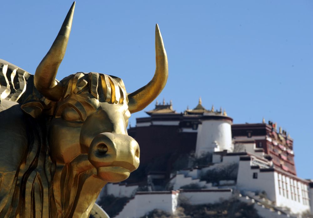 ↑西藏拉萨布达拉宫附近的“牦牛”雕塑(2009年1月27日摄)。1991年,两吨重的拉萨标志性雕塑——“高原之宝”,从内地来到拉萨市中心“定居”。新华社发(格桑达瓦摄)