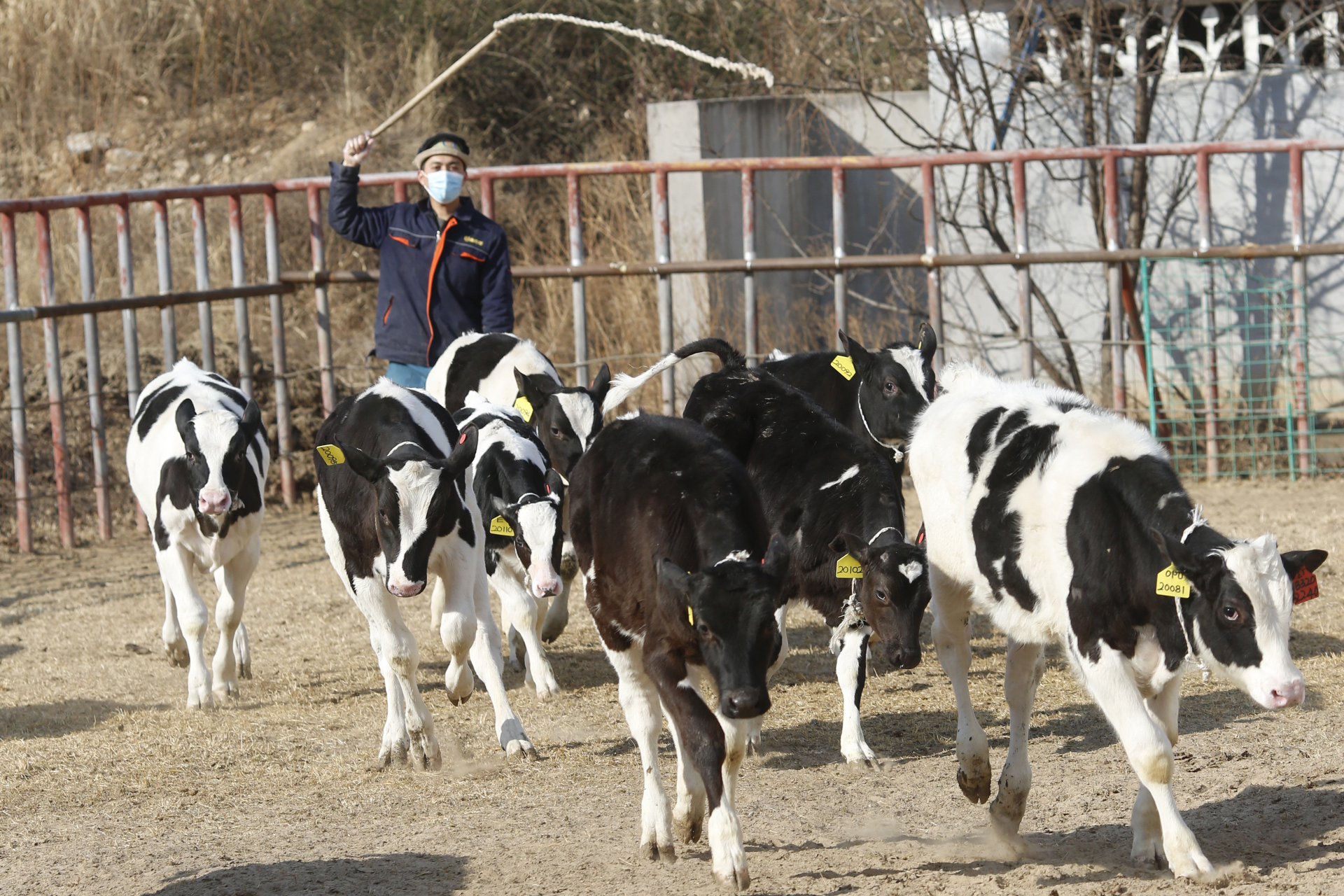 山东奥克斯畜牧种业公司养殖场内,幼年奶牛在工作人员看护下运动。新华社记者 王阳 摄