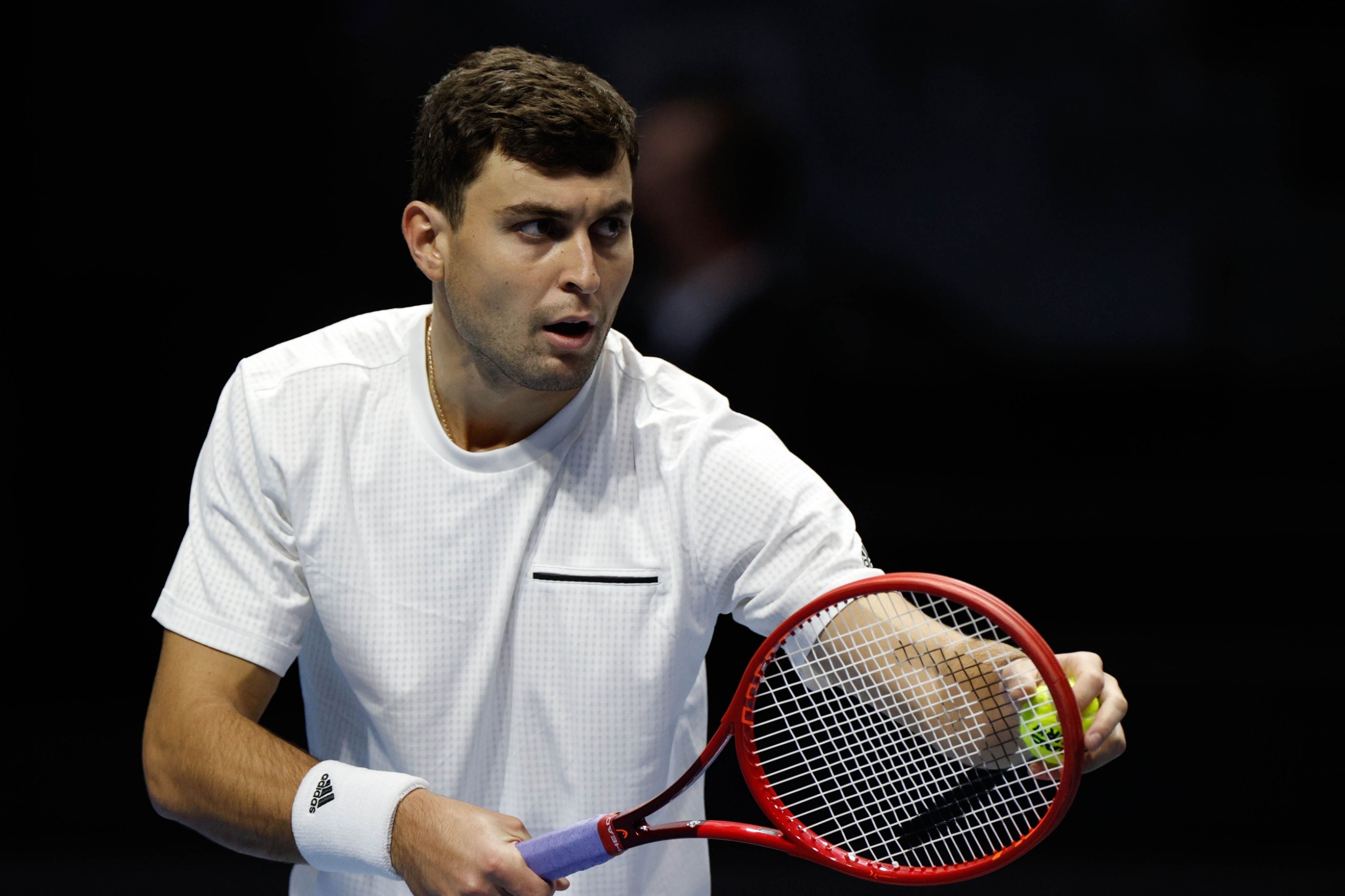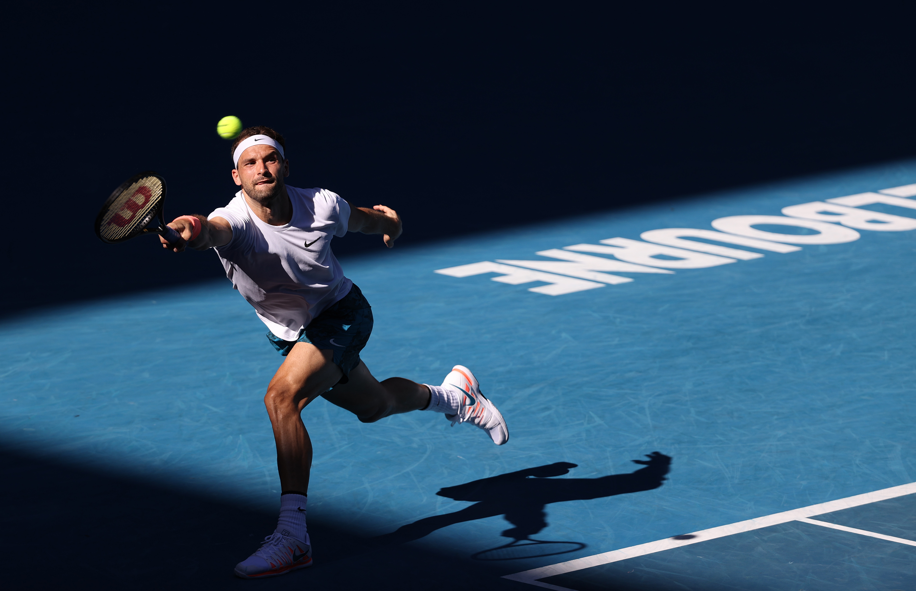 2月14日,保加利亚选手迪米特洛夫在比赛中回球。新华社记者白雪飞摄