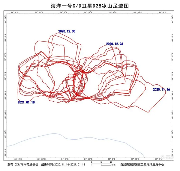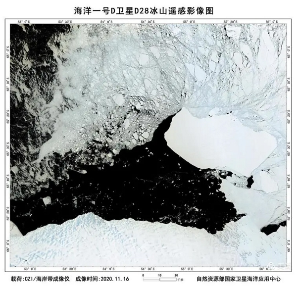 2019年9月25日海洋一号C卫星海洋水色水温扫描仪获取的图像显示,从埃默里冰架(Amery ice shelf)上有冰山脱落,该冰山被编号为D28,2019年10月8日海洋一号C卫星海岸带成像仪图像显示更为清晰,经量算冰山长度约62公里,宽度约38公里,面积达到1730平方公里,大于上海崇明岛面积,与珠海的面积相当,脱落后的D28冰山首先在普里兹湾随波逐流,2020年4月开始漂离普利兹湾,朝西而去,与海岸几乎是平行流动。