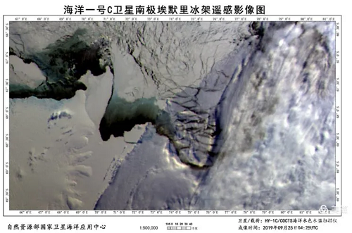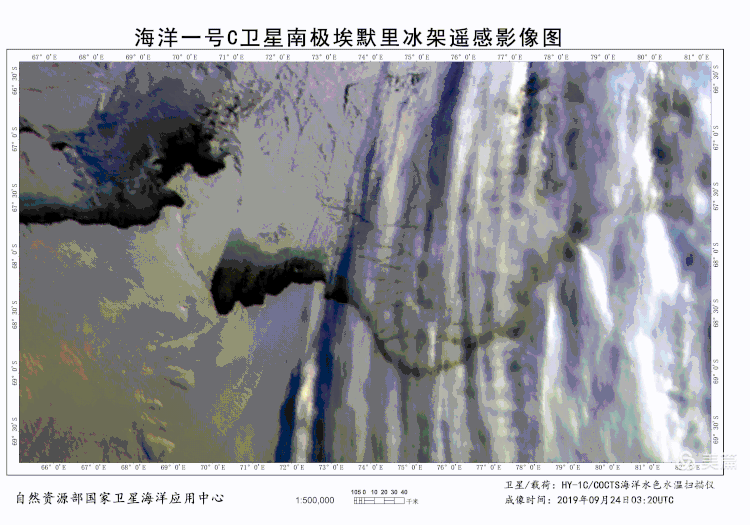 △2019年9月25日4:25UTC,海洋水色水温扫描仪拍摄到冰架已经崩解,冰山脱离冰架漂移动到海洋。