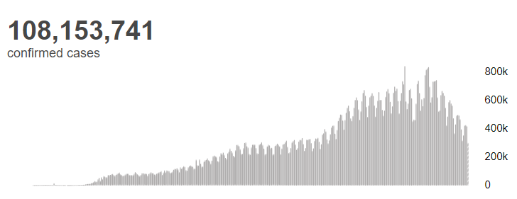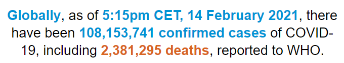 根据世卫组织最新实时统计数据,截至欧洲中部时间2月14日17时15分(北京时间2月15日0时15分),全球累计新冠肺炎确诊病例108153741例,累计死亡病例2381295例。14日全球新冠肺炎确诊病例新增300530例,死亡病例新增7776例。(总台记者 朱赫)