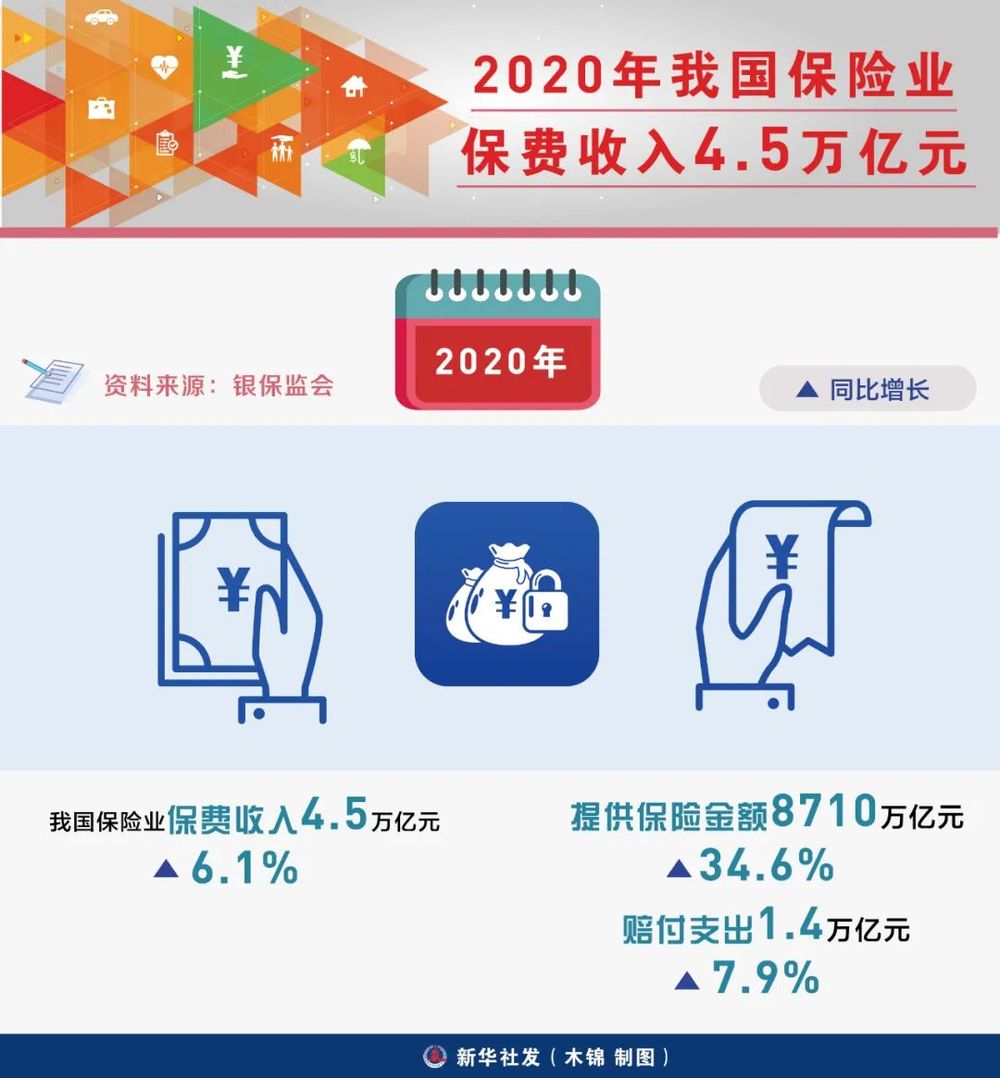 银保监会消息,2020年,我国保险业保费收入4.5万亿元,同比增长6.1%。