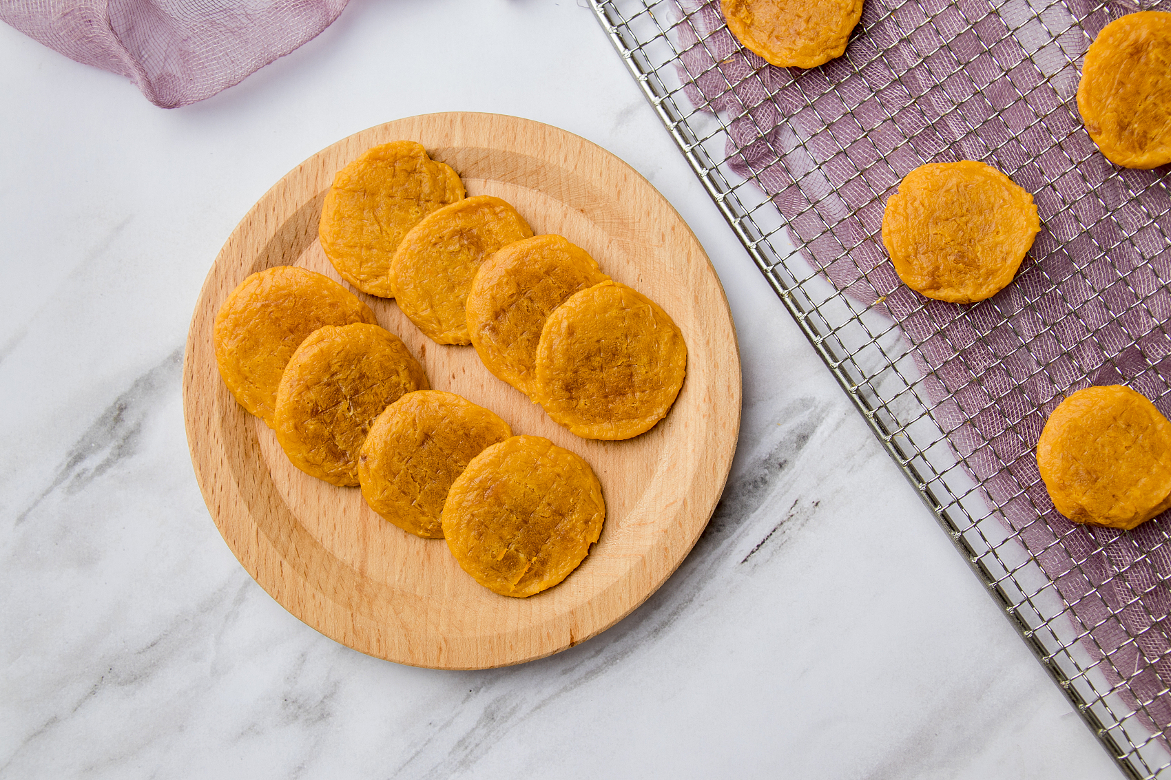 朱大妈制作“番薯胖”,一道道程序井井有条:将番薯洗净,削去皮衣,切成薄片,然后放入铁锅里用柴火慢慢煮熟。等到番薯熟烂,她用铲刀在铁锅里反复将其搅成糊状。抓一把芝麻撒进去,像天女散花;顺手又取些橘子皮碎末往铁锅里抛,如星星点点,这样番薯糊就添了香气。而要把番薯糊做成番薯饼,朱大妈就要用到那个书本大小、四周带着薄薄边框的木制盛具。在盛具上铺一块白净纱布,将锅里捣糊的番薯食材舀在盛具上,用手里的菜刀把糊状的番薯细心地刮齐抹平。最后,将木板盛具倒扣在竹匾或竹帘子上,揭去白纱布,就现出均匀漂亮的番薯饼。