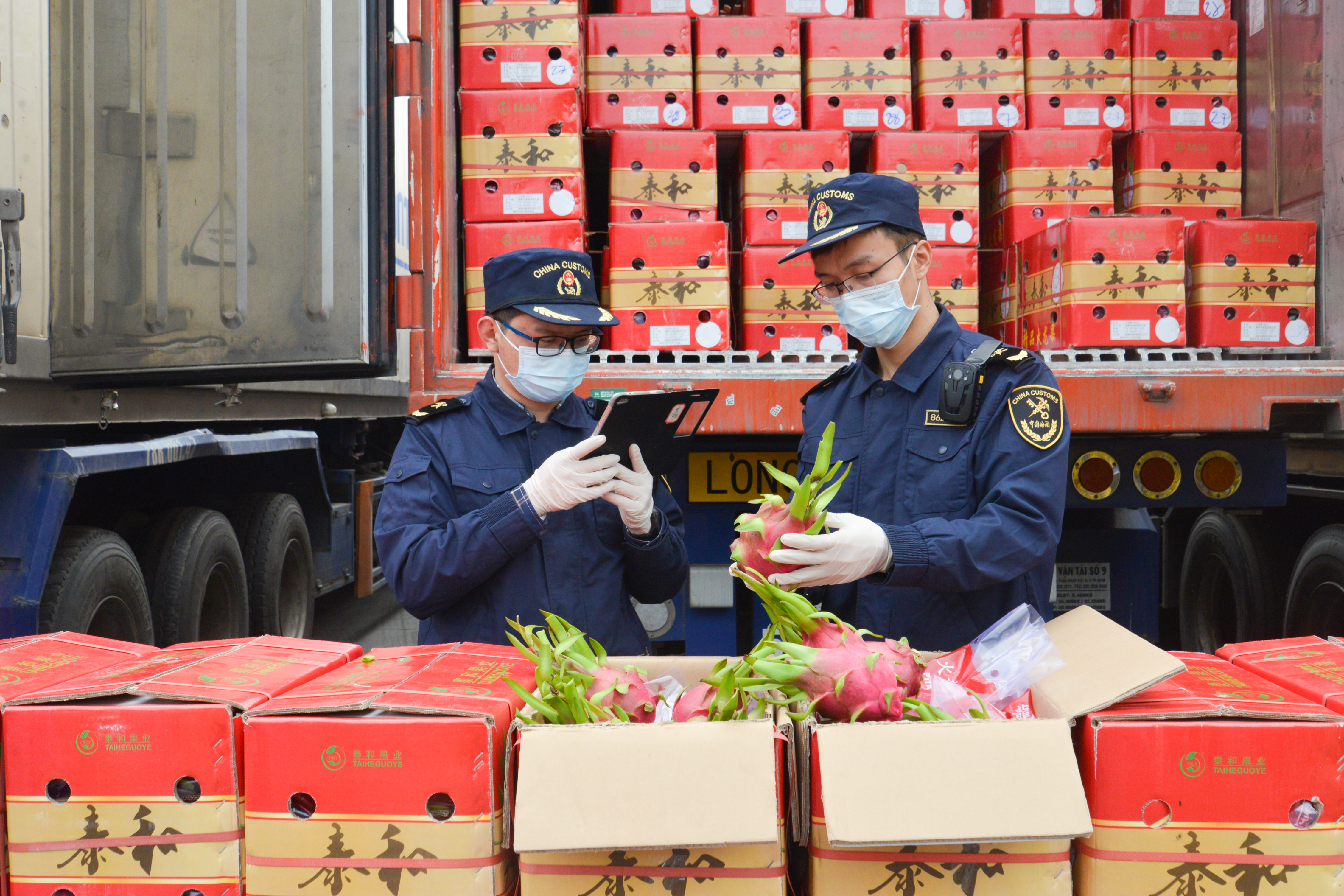 海关关员在云南省河口瑶族自治县对出口水果进行查验。新华社发 陈智东 摄