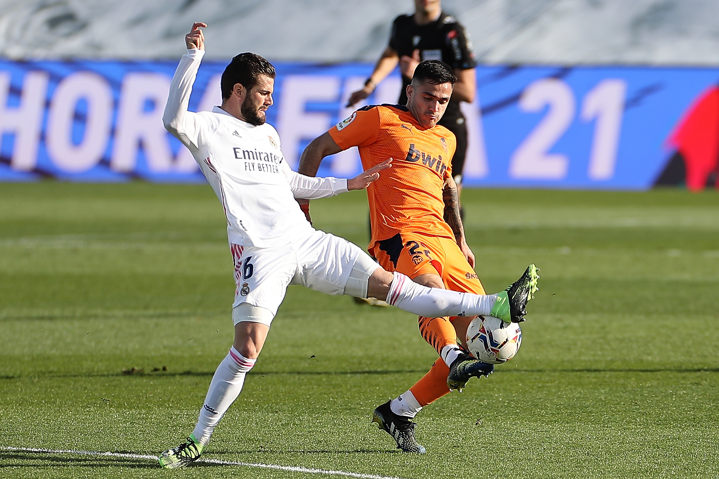 2月14日,皇家马德里队球员纳乔(左)与巴伦西亚队球员马克西·戈麦斯在比赛中拼抢。新华社发(爱德华·皮特斯摄)