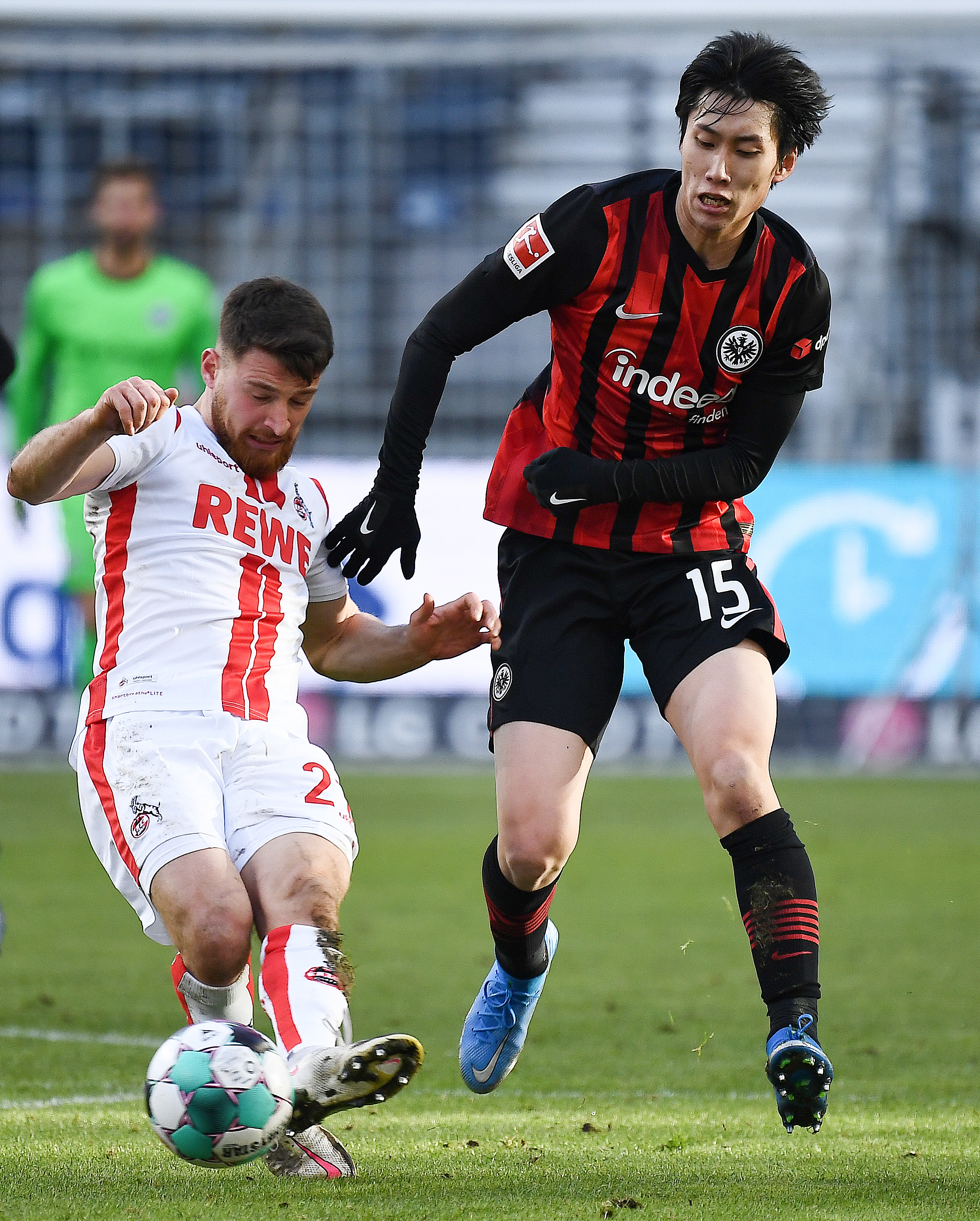 2月14日,法兰克福队球员镰田大地(右)在比赛中与科隆队球员厄兹詹拼抢。新华社发