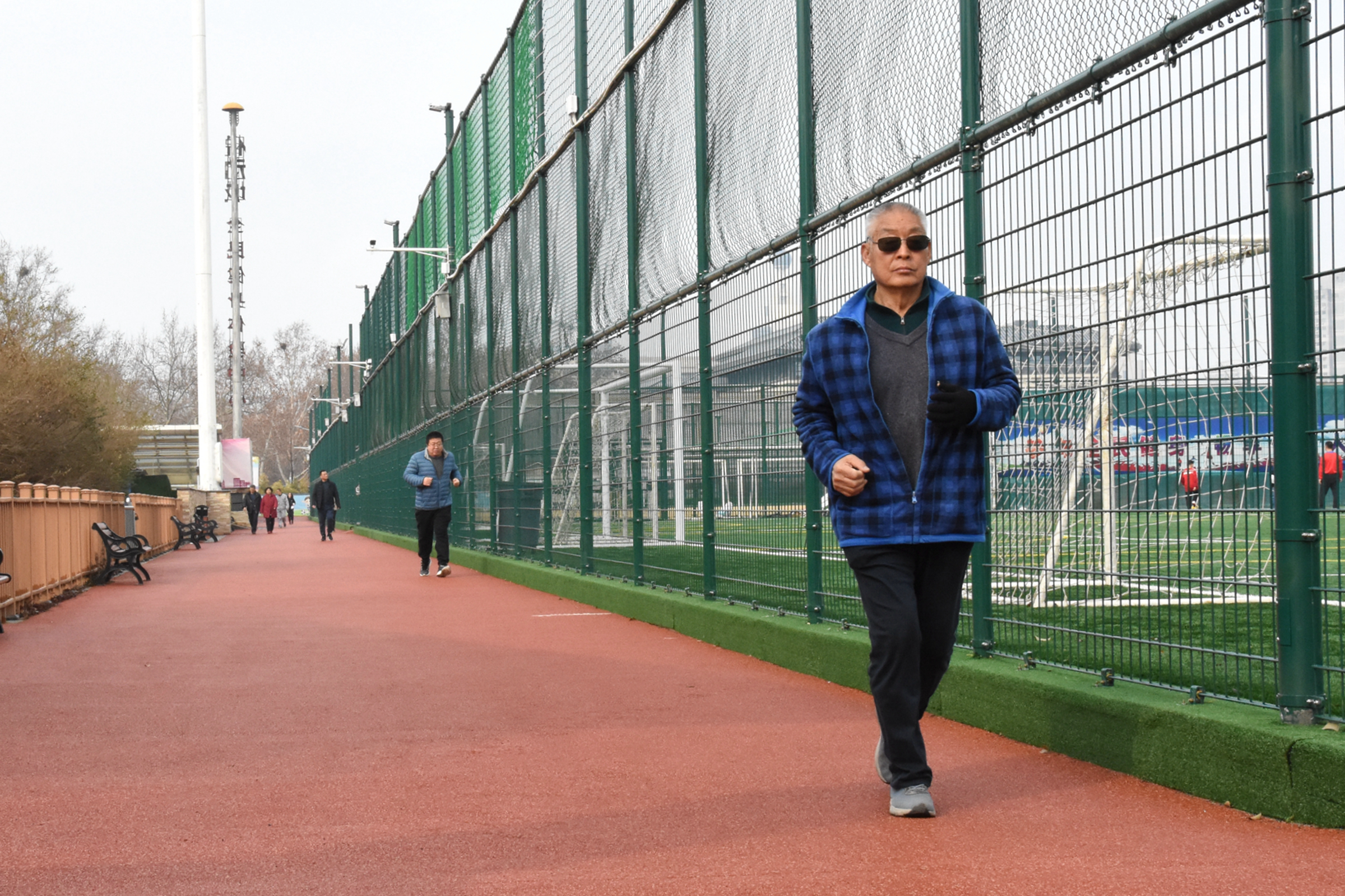 球场围网外的塑胶跑道上,也有几十名市民在运动,或快走,或跑步,或拉伸。
