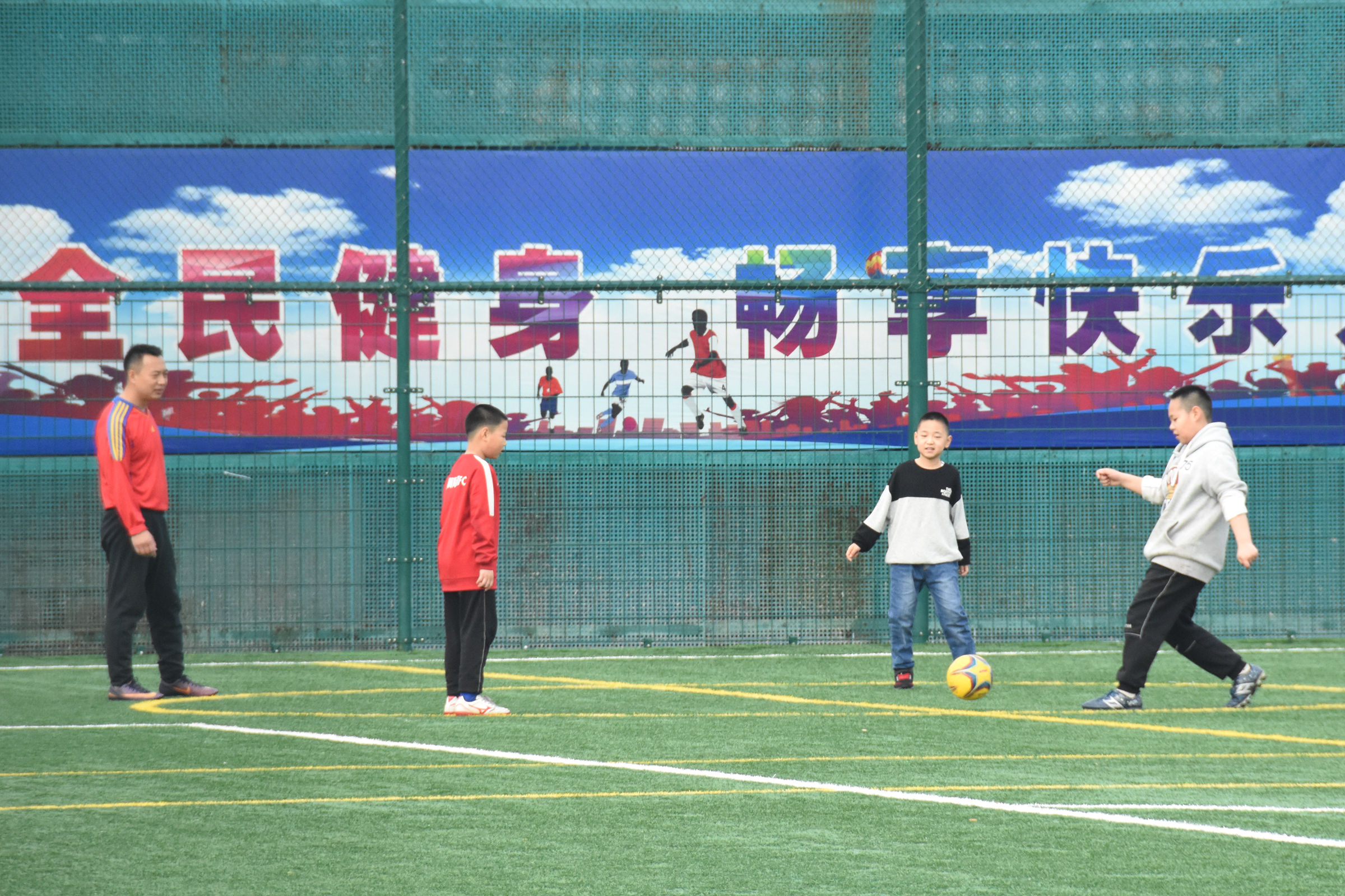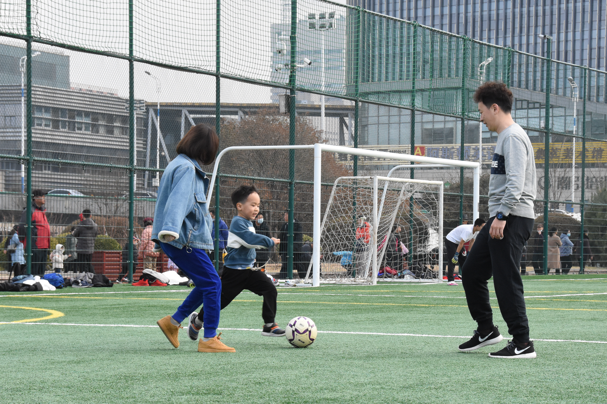 14日上午10时,记者在这里看到,6块五人制足球场已经“人满为患”。场上踢球的人既有成年壮汉,也不乏三四岁的小朋友和“铿锵玫瑰”;有的拉开架势认真踢球,也有家长带着孩子练习简单的传接球,一片其乐融融,不时传出叫好声。