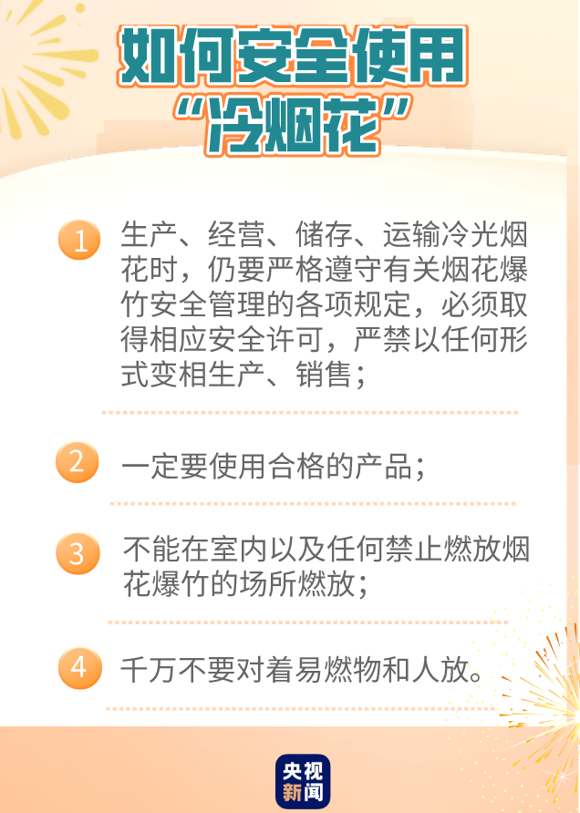 针对“冷光烟花”兴起的情况,国务院安委办、应急管理部表示,冷光烟花虽然火焰温度较低、烟雾较少,但喷射口温度仍高达700-800℃,可灼伤人体、引燃物品,作为烟花爆竹,其易燃易爆危险品的基本属性并未改变。