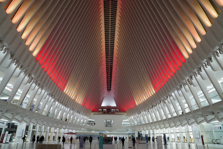 2月10日,美国纽约奥克卢斯购物中心亮起红、金两色的灯光。美国纽约多个地标当晚共同为中国年亮灯,庆祝中国春节。新华社记者王迎摄