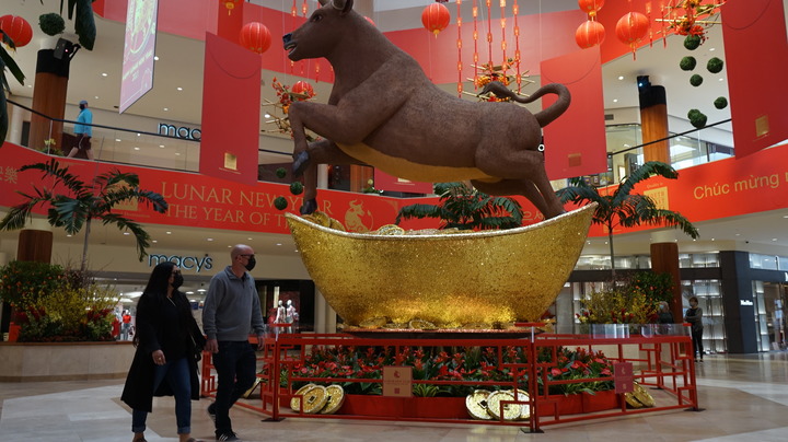 2月11日,在美国加利福尼亚州科斯塔梅萨,人们从购物广场内一处牛的雕塑旁经过。为庆祝中国春节,海外许多地方被红灯笼、对联等中国特色的春节装饰所装点,为当地增添了中国年味儿。新华社发(曾慧摄)