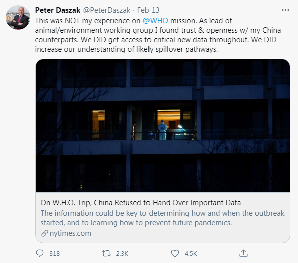 世界卫生组织赴武汉国际专家组成员彼得·达萨克在社交媒体推特上发文驳斥《纽约时报》的报道。网络截图