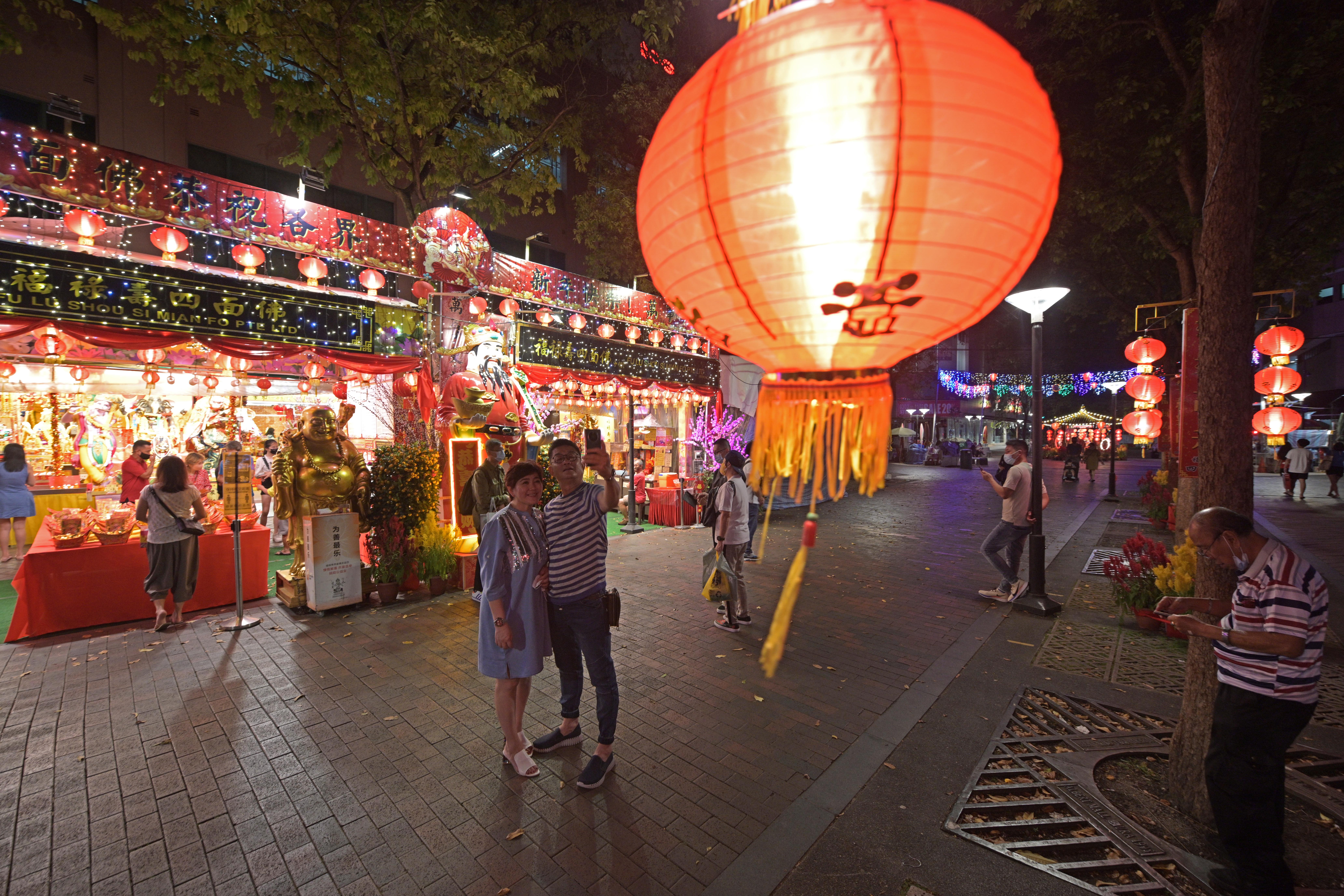 2月11日,人们在新加坡街头的红灯笼旁自拍。为庆祝中国春节,海外许多地方被红灯笼、对联等中国特色的春节装饰所装点,为当地增添了中国年味儿。(新华社发,邓智炜摄)