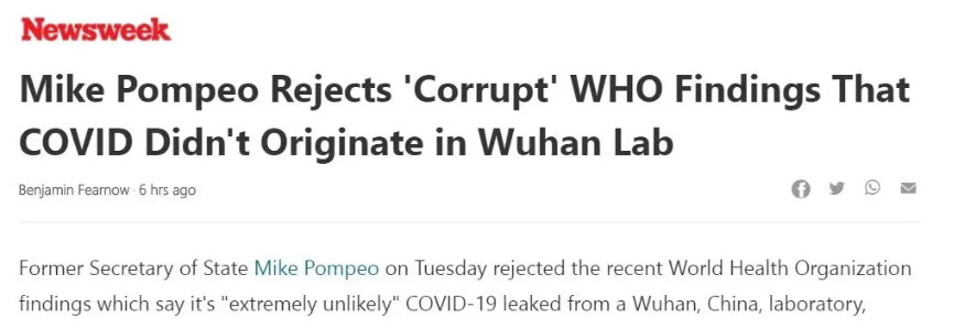 △《新闻周刊》网站报道,蓬佩奥拒绝世卫组织专家在武汉得出的研究成果。