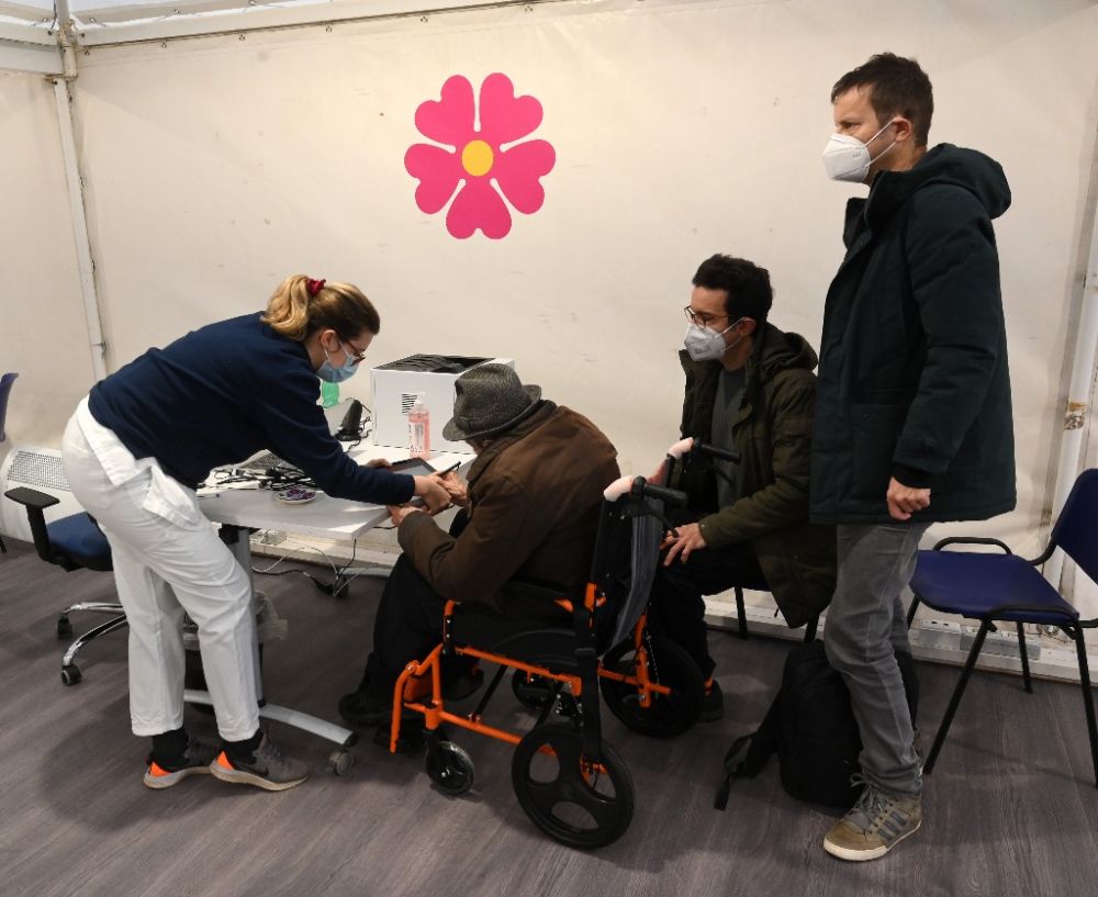 2月8日,在意大利罗马,医护人员帮助一名老人在接种新冠疫苗前登记。新华社发(阿尔贝托·林格利亚摄)