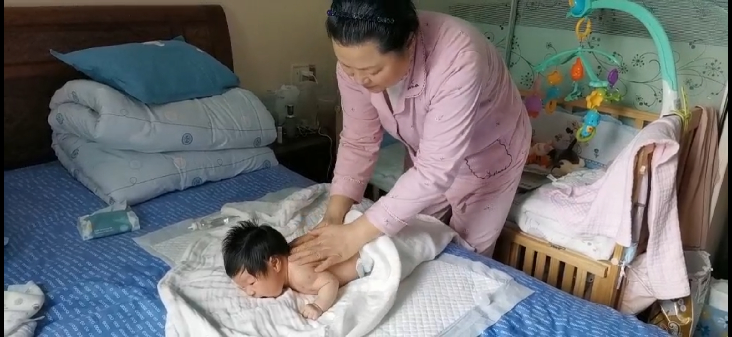 朱宇晓在进行婴儿抚触。(受访者供图)