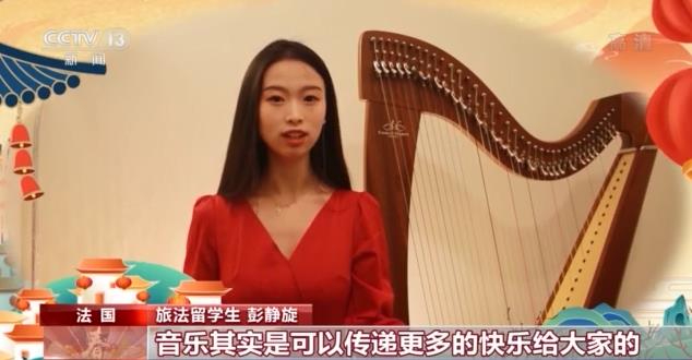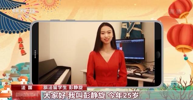 旅法留学生 彭静旋:我学习的专业在法国是音乐学专业,其实我研究的课题也是更偏向于中西文化,或者东方音乐与西方音乐的一个碰撞,音乐是可以传递更多的快乐给大家的。比如说这样,然后在这里想跟国内的家人朋友们说 ,我想死你们了,祝大家新年快乐。