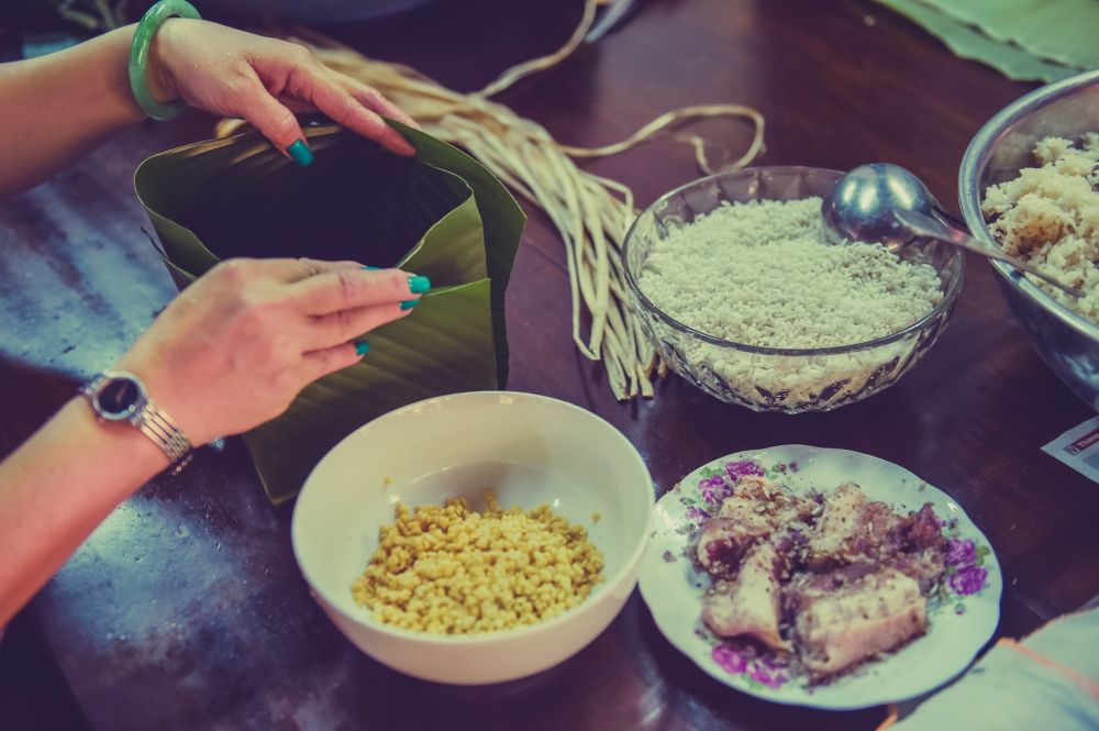 跟我们一样,越南人除夕要赶回家团聚,全家围坐在桌旁,吃上一餐丰盛的团圆饭,其中有一样必不可少的食品就是粽子。