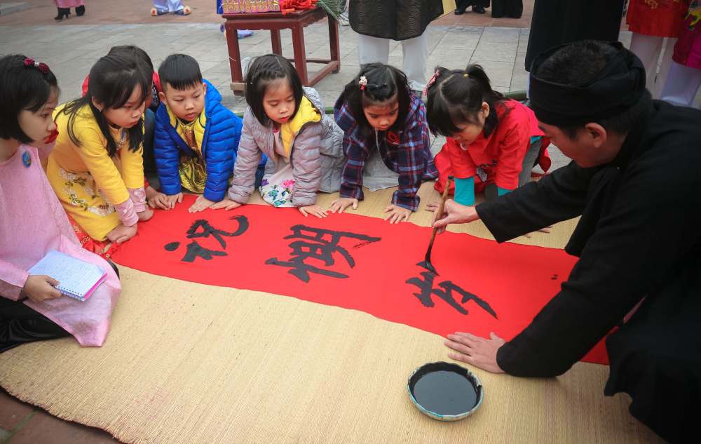 在河内市文庙的节前对联一条街,选购对联及字帖的顾客络绎不绝。
