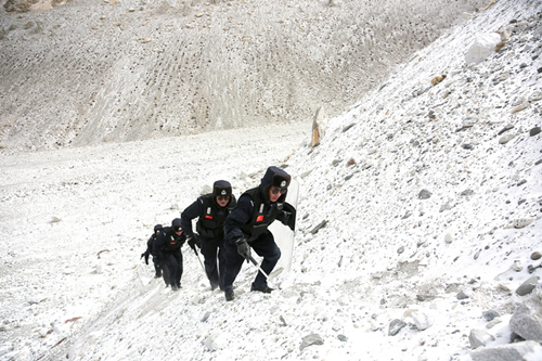 郑劲松(右一)和战友们在珠穆朗玛峰核心景区巡逻(2月7日摄)。新华社发(何宇恒 摄)
